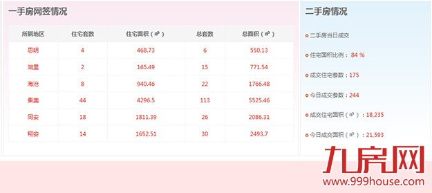 2015年11月9日,全市二手房成交套数为244套,二手房成交住宅套数成交175套,一手住宅成交90套。思明区4套,湖里区2套,海沧区8套,集美区44套,同安区18套,翔安14套。