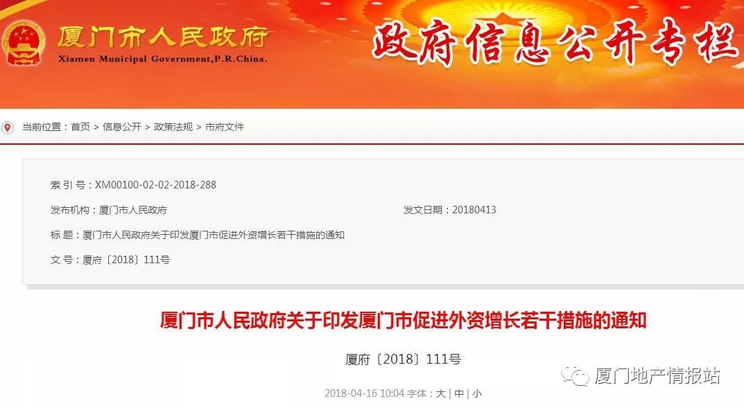 2018年4月,厦门市政府发布《厦门市促进外资增长若干措施》。