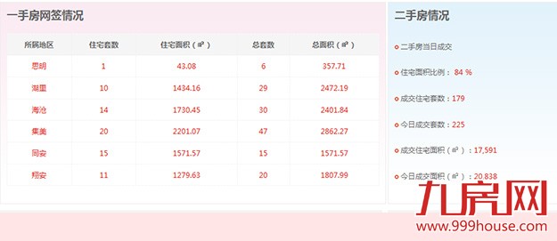 2015年11月10日,全市二手房成交套数为225套,二手房成交住宅套数成交179套,一手住宅成交71套。思明区1套,湖里区10套,海沧区14套,集美区20套,同安区15套,翔安11套。