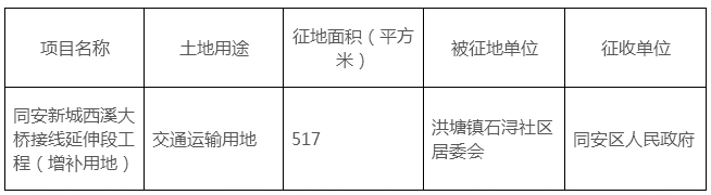 征收同安区洪塘镇石浔社区集体土地517平方米,作为同安新城西溪大桥接线延伸段工程(增补用地)项目建设用地。