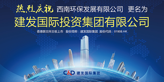 2016年3月1日12点30分许,“西南环保”(股票代码:HK.01908)正式更名为“建发国际投资集团有限公司”(股份简称“建发国际集团”)。“更名后,建发国际集团将始终坚持‘积极进取、合作共赢’的核心价值观,依托母公司丰富的资源及成熟的品牌优势,引入先进的管理理念和优秀的企业文化,充分发挥香港资本平台的优势,逐步发展成为国内一流、国际知名的国际投资管理集团。”建发国际集团董事长庄跃凯先生在更名仪式上表示。