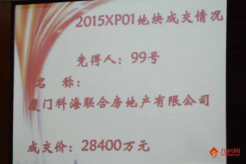 3月19日2015XP01商住用地位于翔安区13-04片区滨海东大道与内垵大道交叉口西南侧,占地面积27396.038平方米,建筑面积70000平方米,拍卖总起价28400万元,起拍楼面价4057.14元/平方米,该地块由科海联合房地产有限公司底价成交。