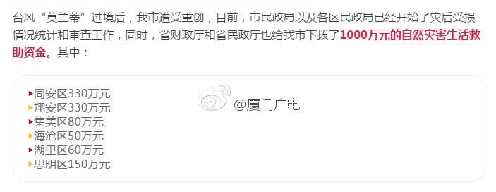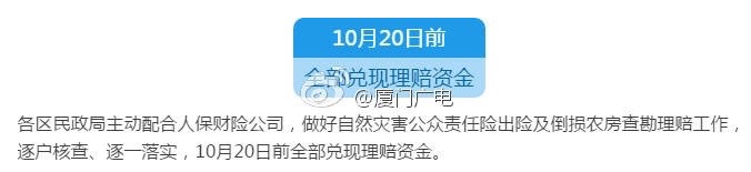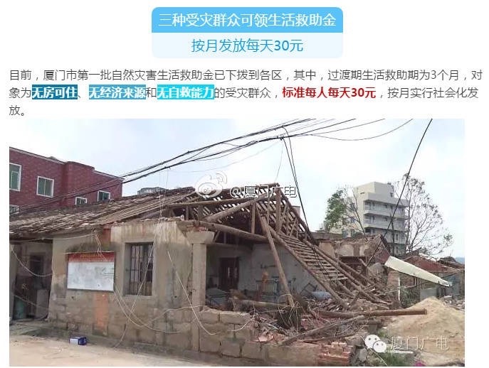 扩散!厦门三种受灾群众可领救助金!每人每天可获30元。台风过后,为了让受灾的困难群众,可以早日重建家园,厦门政府部门推出了相关补助措施!