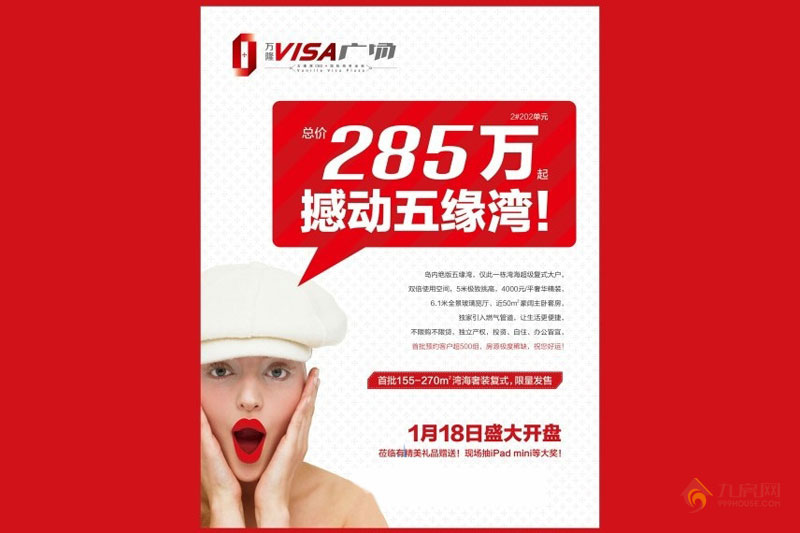 据悉,1月18日,万隆VISA广场首批155-270㎡湾海豪装复试公馆即将发售,285万就能入主五缘湾,还带4000元/㎡的精装修,仅70套房源,预约客户已经达到500多组。届时,到场还将有精美礼品赠送,还可参与抽取Ipad mini等大奖。