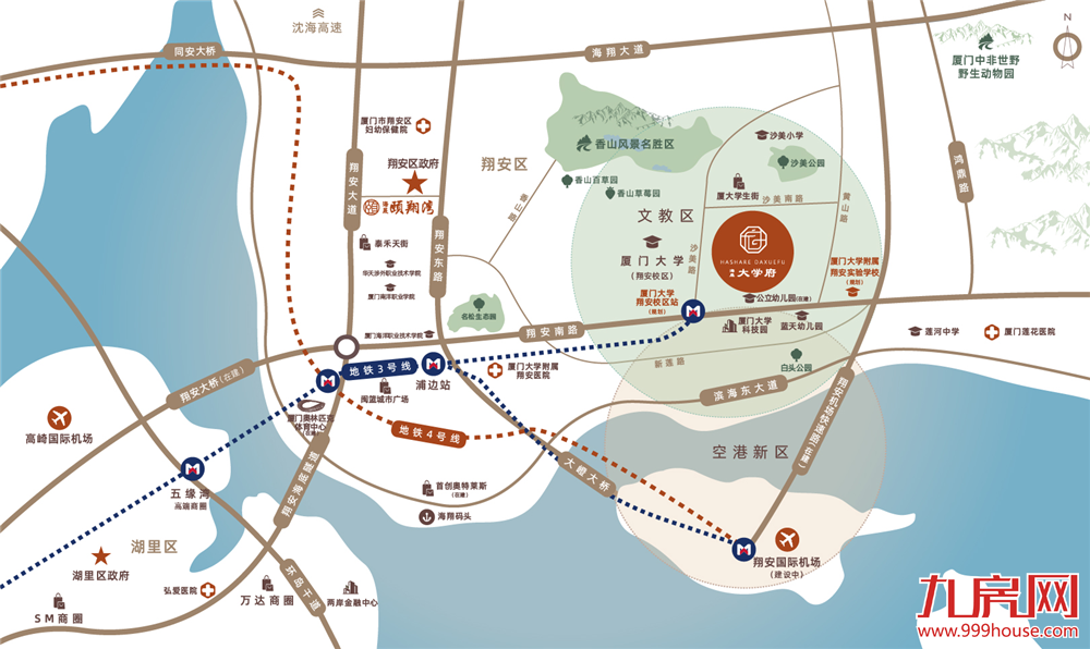 | 自驾 | 项目周边享有厦门第二东通道——翔安大桥、翔安隧道、厦金大桥(规划中)等多元化交通配套,交通便捷。同时,地铁3号线将于2020年正式运行,项目紧邻3号线延伸线厦大翔安校区地铁站(规划中),未来家门口即可快速抵达岛内外各区。未来厦门轨道3号线支线由厦门市翔安区向东延伸至泉州市南翼新城,抵达石井,加强厦漳泉一体化建设。翔安“海陆空”立体交通网络逐步形成。 |